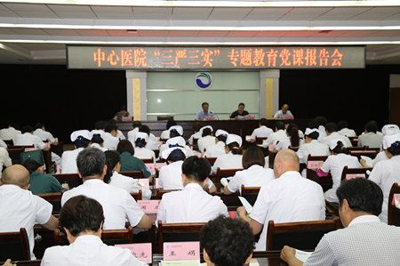 本站讯 6月10日,我院召开“三严三实”专题教育党课报告会,院党委书记、副院长孙振伟作了题为《践行“三严三实”,推动医院内涵发展》的专题报告,院长、党委副书记翟振龙主持会议,医院领导及全体中层干部参加会议。