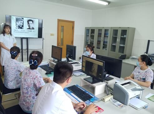 为扎实推进党史学习教育和激发党员立足岗位担当作为,近日,我院组建了一支年轻的党史学习教育宣讲员志愿队,以“党史故事听我讲”微宣讲的形式走进科室、走进支部,用一个个感人的红色故事,引导党员干部和广大群众知党史、感党恩、跟党走,坚定理想信念,不忘行医初心,用实际行动为建党100周年增光添彩。图为6月29日,宣讲志愿者王一阁于血液内科讲述邓稼先的故事。(刘小芸)