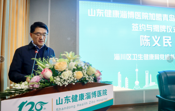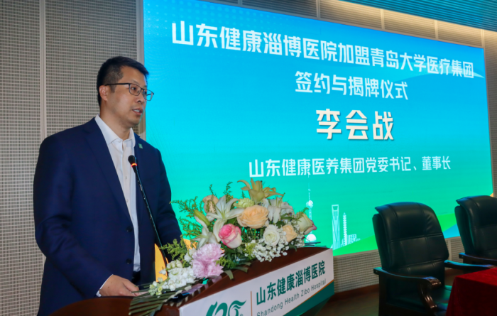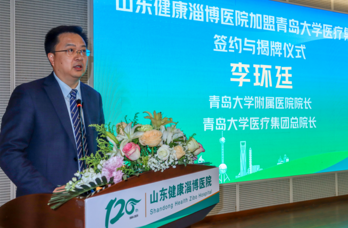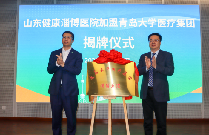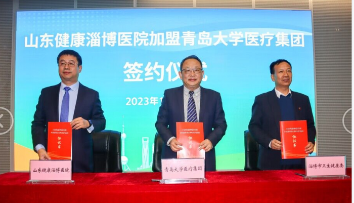 青岛大学医疗集团常务副书记姜卫东、淄博市卫健委副主任刘观湘、山东健康淄博医院党委书记、院长赵建成共同签署医联体合作协议。李环廷、李会战为“青岛大学医疗集团淄博医院”揭牌。