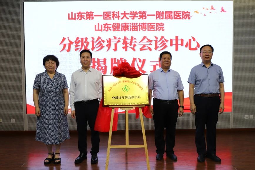 山东第一医科大学第一附属医院院长田辉、淄川区卫健局局长翟配海等共同为““山东第一医科大学第一附属医院、山东健康淄博医院分级诊疗转会诊中心”揭牌并致辞,淄博市卫健委副主任张恒龙主持会议,100 余位医疗领域代表共同见证这一重要时刻。