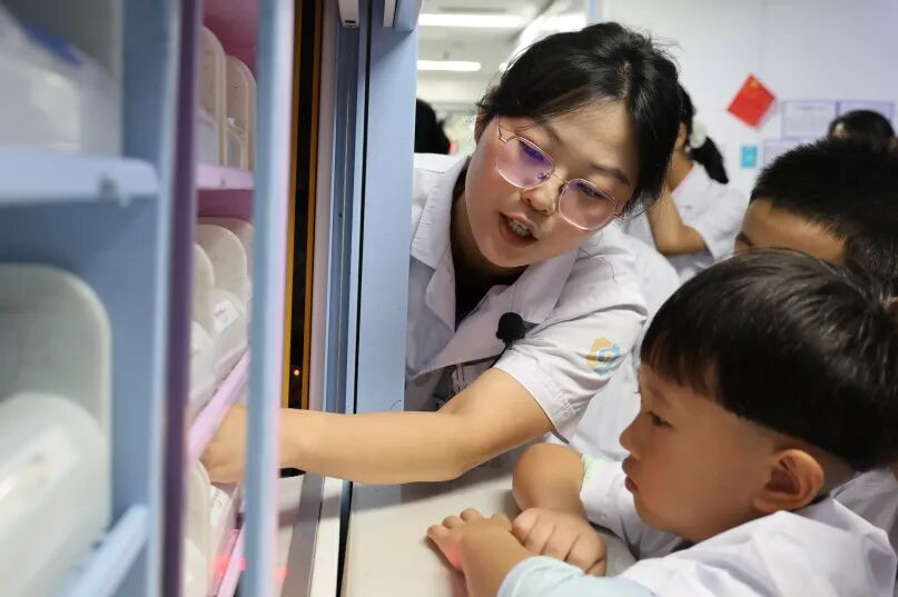 在药房,医务人员向小朋友们介绍了快速发药机、针剂智能调配机,并逐一参观了冷藏药品区、阴凉药品区、常温药品区,了解了什么是药品,如何辨别药品与保健品,如何区分口服、外用药品,药品如何储存摆放,家庭药品储存及安全用药小知识。