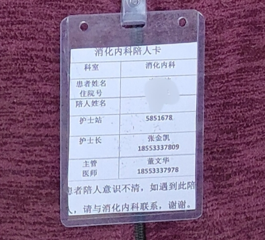 该患者于夜间经急诊入院后,消化内科董文华医师迅速接诊,凭借丰富的临床经验精准制定诊疗方案,为后续治疗奠定基础。夜班护士沈振美在护理过程中发现,患者家属存在精神障碍,出病房后竟无法自行回到病房,无法独立完成陪护任务。护理团队高度重视并立即上报情况,护士长张金凯第一时间启动应急预案,联合综合服务部吕丽主任展开援助。两人不仅为家属定制早餐解决就餐难题,还专门制作了标注患者及陪护信息、科室联系方式的“爱心胸牌”,确保患者家属在院内的安全。