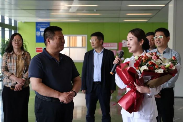 上午,淄川区卫健局党组书记、局长翟配海率队一行4人,专程来到山东健康淄博医院,亲切慰问奋战在临床一线的护理人员。翟局长亲手为护士送上鲜花,并致以诚挚的节日问候。他高度赞扬了护理团队在医疗救治、患者服务中的辛勤付出,勉励大家继续发扬南丁格尔精神,以专业和爱心守护群众健康。