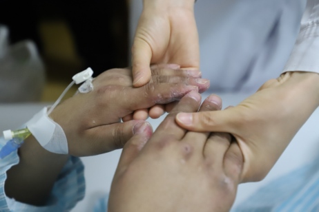 图为一个有皮肤损伤的皮肌炎患者正在接受医护人员的检查。