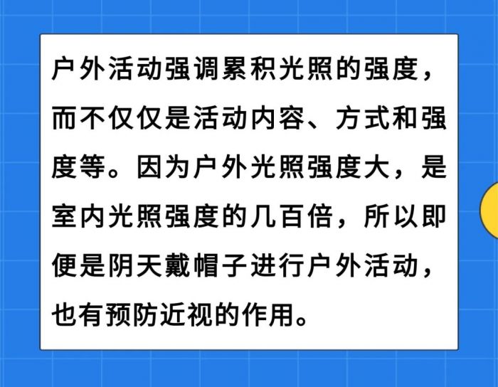 增加户外活动时间是最有效、最经济的近视防控方法。户外活动预防近视主要与多巴胺有关。室外较高的光照水平会促进眼睛释放更多的多巴胺,延缓眼轴增长,从而起到预防近视的作用。此外,户外的强光照射会使瞳孔缩小、景深加深、模糊减少,这也可能对预防近视起到了作用。 建议孩子每天户外活动时间累计不少于2小时,每周累计不少于14小时。