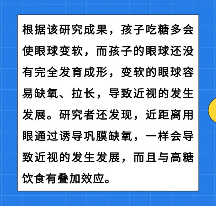 2024年1月16日,温州医科大学附属眼视光医院团队的一项研究成果,揭示了糖酵解激活是巩膜细胞外基质重塑诱导近视形成的关键分子机制,并提供了潜在的近视防控的新靶点和策略。 所以,家长不仅要控制孩子吃糖的量,还要建议孩子餐后1小时内避免或尽量减少近距离用眼。否则,餐后胰岛素的飙升和近距离用眼导致的缺氧会给眼球带来双重打击。