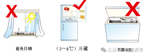 ⑦未开封的胰岛素置于冰箱中(2~8℃)冷藏保存;开启后的胰岛素室温(25℃以下)保存4周;所有胰岛素均不可冷冻,避免震荡、过热和阳光直射;