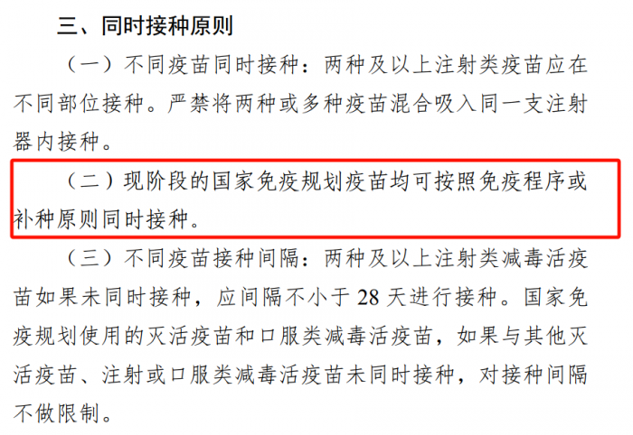 另外,《国家免疫规划疫苗儿童免疫程序及说明(2021版)》也明确指出:现阶段的国家免疫规划疫苗均可按照免疫程序或补种原则同时接种。