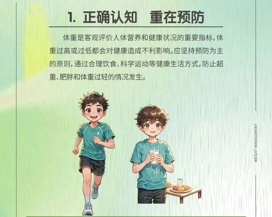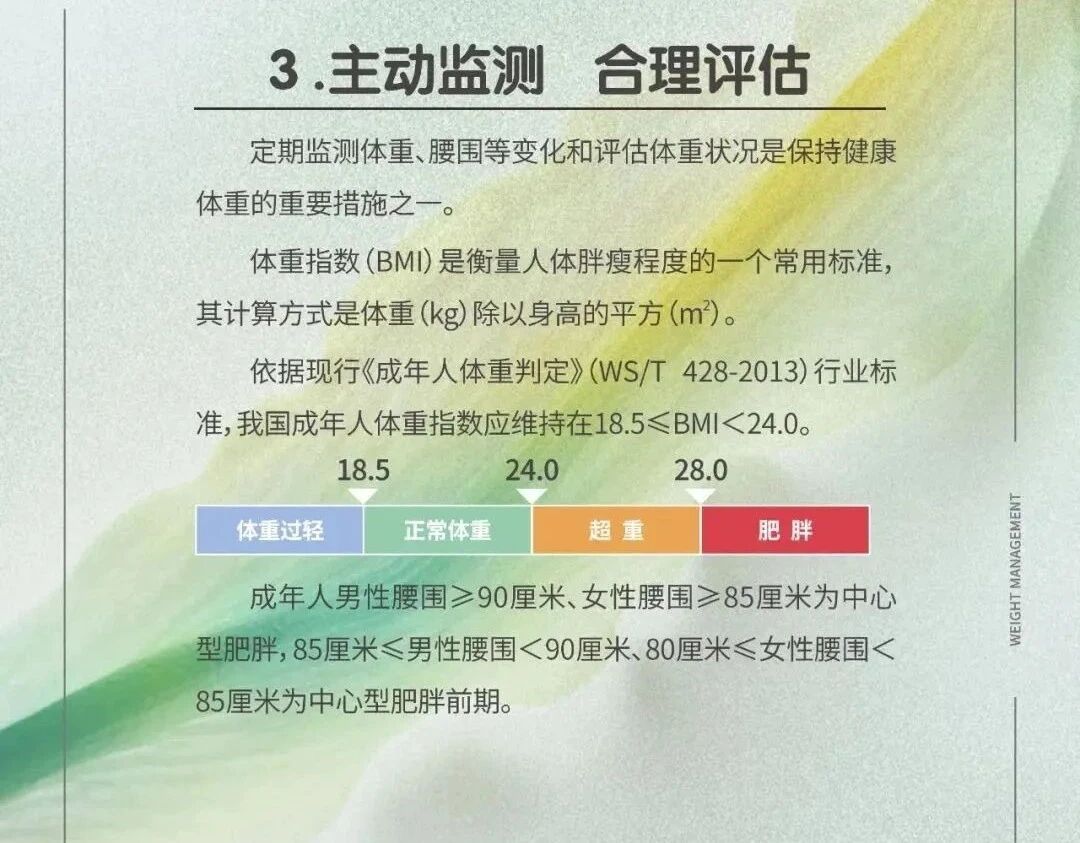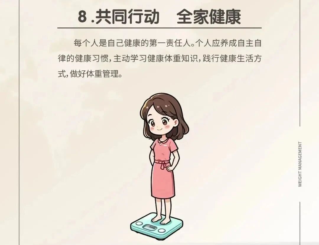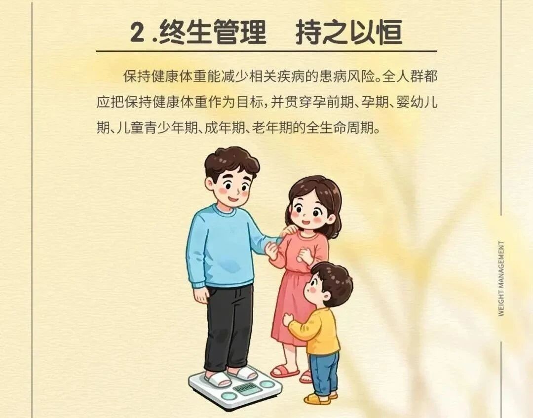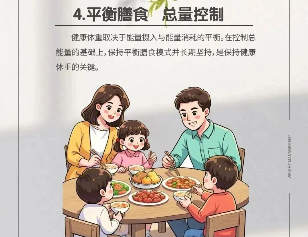 9月份是全民健康生活方式宣传月, 2025年的宣传主题是: 培养健康生活方式, 筑牢家庭健康基石。 健康体重成为社会关注的新焦点。 随着生活水平提高, 超重和肥胖已成为影响居民健康的重要问题。 科学体重管理不仅能降低慢性病风险, 更能提升生活质量。 无论是预防肥胖还是科学减重, 掌握正确方法才能事半功倍, 让体重管理成为守护健康的持久习惯。 当餐桌上的饭菜愈发丰盛,电梯渐渐取代了楼梯,屏幕时间不断挤压运动时光,一个不容忽视的问题正悄然在家庭中蔓延——家庭聚集性肥胖风险。 2025年《中国居民体重管理指南》数据显示,我国成年居民超重肥胖率已突破50%;而《成人健康体重管理白皮书(2025)》进一步指出,尽管73%的受访者具备体重管理意识,但33%的人对自身体重的判断与实际情况存在偏差。视觉上的“不胖”,很可能掩盖了潜在的健康风险,这也正是全家携手行动、共同管理体重的关键意义所在。 国家卫健委推荐的“胖瘦金标准”明确:体重指数(BMI)的计算方式为体重(kg)除以身高(m)的平方,其健康范围为18.5-23.9;若≥24则属于超重,≥28便判定为肥胖。 除了体重,腰围更是预警“隐形杀手”的重要指标——男性腰围需控制在85cm以内,女性需控制在80cm以内。一旦腰围超标,患上高血压、糖尿病等慢性病的风险将会成倍增加。 健康体重管理需践行“三知一管”理念,即知晓标准、监测变化、掌握方法、科学管理。具体落地可分为以下三步: 1. 设定合理减重目标(新手入门必看) - 每周减重0.5-1斤,相当于每天少吃1碗饭+多走5000步。 - 6个月内减掉初始体重的5%-15%,例如160斤人群,目标减重8-24斤。 2. 推行“吃饭改造计划”,轻松控量 遵循“211餐盘法”:每餐包含2份蔬菜(约500g)、1份优质蛋白(如1个鸡蛋+1掌心量肉类)、1份全谷物主食(1拳头米饭)。烹饪优先选择蒸煮炖拌,减少煎炸烤;放慢进食速度(每口咀嚼20-30次)、使用小号餐具,可减少15%-20%的食物摄入量。 特别提醒:北方人群需减少大酱食用,南方人群应避开糖醋汁、什锦酱等高热量调味。 示例食谱: - 早餐:鸡蛋+杂粮粥+1个苹果 - 午餐:清蒸鱼+糙米饭+凉拌菠菜 - 晚餐:豆腐汤+玉米+西蓝花 3. 掌握“不痛苦运动法”,随时随地动起来 - 上班族:每天快走通勤20分钟,午休时做拉伸,累计每周运动150分钟。 - 大体重人群:选择水中走路(减轻膝盖压力)、椅子深蹲等低负担运动。 - 懒人巧运动:看剧时抬腿、等电梯时踮脚,碎片化时间也能活动身体。 ❌ 误区:节食减肥(降低代谢,易反弹)、水果代餐(荔枝、榴莲热量堪比米饭) 从体重秤上的数字到餐桌上的搭配,健康体重管理从来不是个人的“战役”。当全家一起把“称体重、测腰围”变成像吃饭睡觉一样的日常,把“211餐盘”和“饭后散步”融入生活,健康的种子便会在家庭土壤中生根发芽。这个秋天,就让“一秤一尺一日历”成为你家的新成员吧