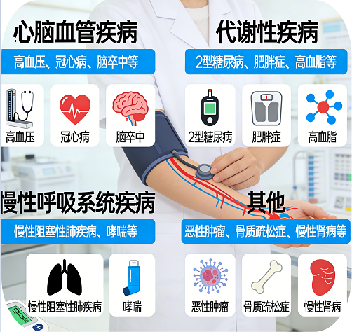 慢病全称慢性非传染性疾病,指病程长、进展缓慢、难以治愈但可预防的疾病总称。常见类型包括: