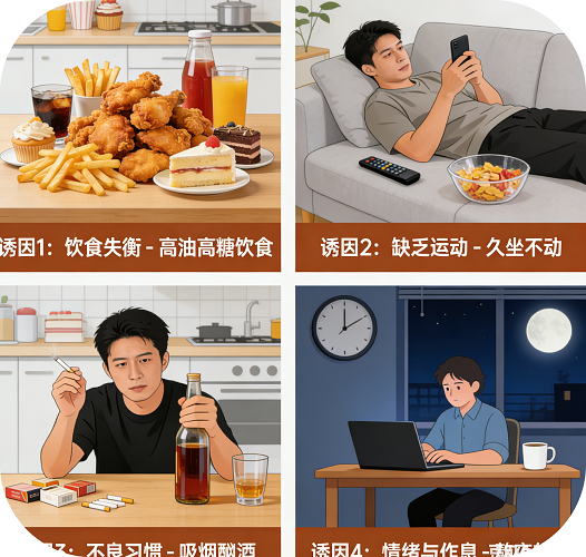 3. 不良习惯:吸烟、过量饮酒,会直接损伤血管、肝脏等器官,诱发多种慢病;