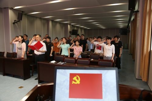 会议最后举行了重温入党誓词活动,党员们在党委书记、院长翟振龙的领誓下,面对鲜红的党旗,共同高举右手,庄严地进行了宣誓,铿锵誓言久久回荡,让现场所有党员更加坚定牢记自己的庄严承诺。