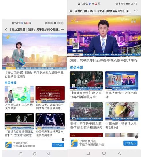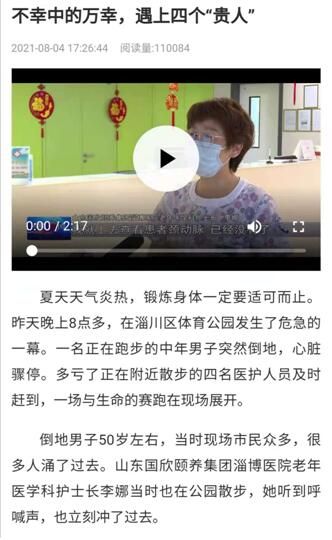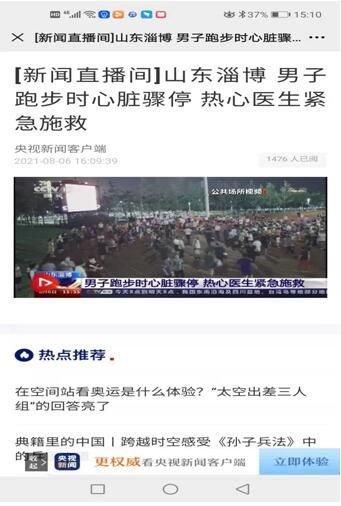 我院的四位医护人员,在淄川体育公园合力救治心脏骤停患者的事迹通过电视、电台广播、微信、视频号、抖音等不同形式得到广泛传播,并荣登央视13频道《新闻直播间》,山东卫视《早间新闻》、齐鲁频道《每日新闻》,市民们纷纷为他们救死扶伤的行为和精湛的急救水平点赞。