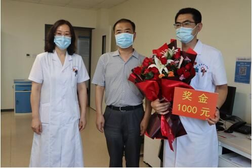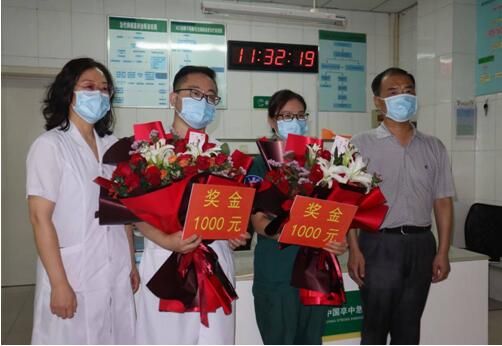8月5日上午,我院党委书记、院长翟振龙、工会主席陈艾洁就把鲜花和奖金送到了本院职工李明晖、郑胜会、赵伟明、李娜四人手中,奖励他们关键时刻挺身而出救治患者。