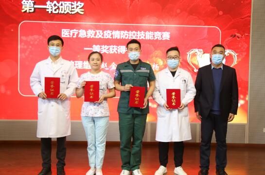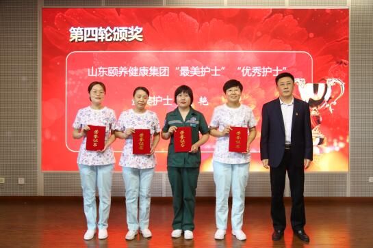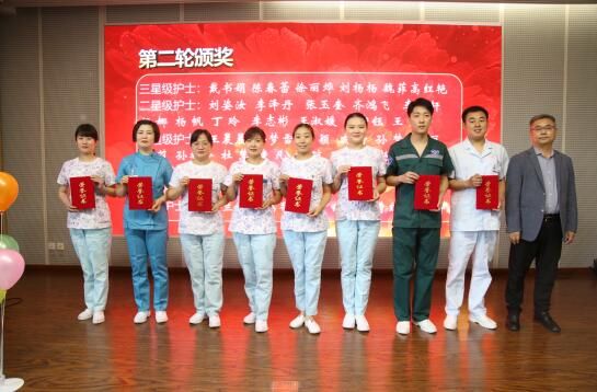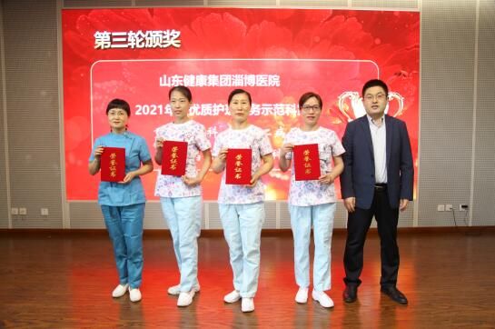 院领导班子成员分别向 “医疗急救及疫情防控技能竞赛”一等奖获得者;2021年度42名星级护士、6名优秀护士长代表;4个优质护理服务示范科室;获得山东健康集团“最美护士”及“优秀护士”的4名护理人员进行了现场颁奖。