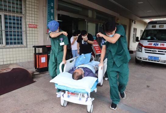 实战演练环节,模拟医院车队楼一楼仓库突发火情,车队工作人员立即通知消防控制室,即刻启动灭火与应急疏散演练预案。医院各个处置小组接到指令后,按照疏散演练方案,各小组现场按照分工及火情进展情况有序行动,灭火行动组迅速连接水带、水枪进行灭火;疏散引导与安全警戒组迅速通知人员疏散及病人转运;通讯联络组立即通知医疗救治与后勤保障,赶赴现场准备医疗救援及物资支援。信息中心、基建部、消毒供应室人员备好湿毛巾,做好疏散准备并立即疏散;急诊科准备氧气、监护、急救物品,做好危重患者转科准备及其他患者疏散准备,并立即转运。
