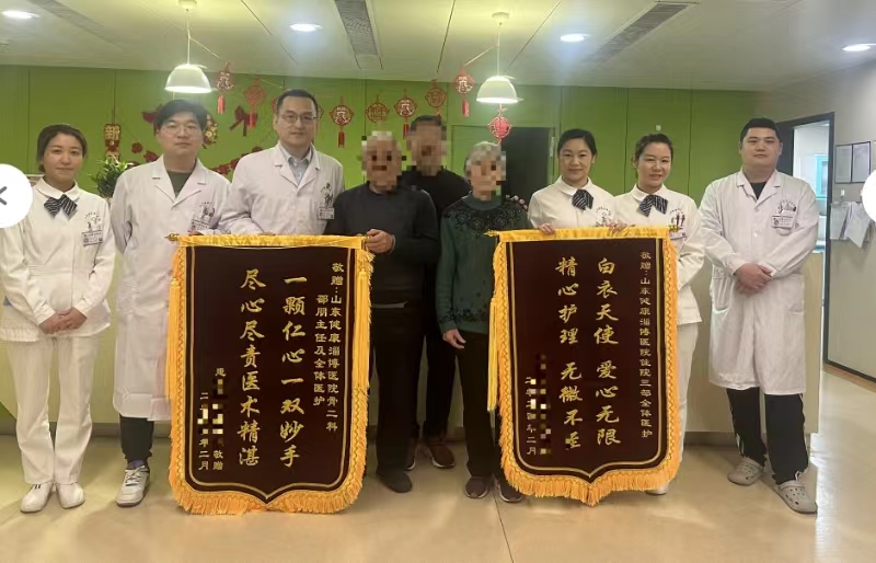 “一颗仁心一双妙手 尽职尽责医术精湛”,“白衣天使爱心无限 精心护理无微不至”。出院之际,老人家属为我们医疗团队和护理团队分别赠送了锦旗,以表达对我们医护人员的万分感谢和崇高敬意。