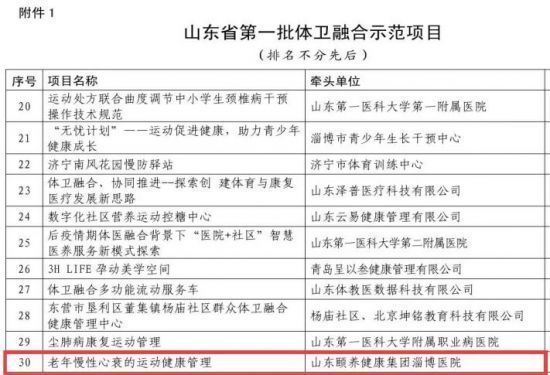 近日,山东省体育局、山东省卫健委联合发布《关于公布山东省第一批体卫融合示范项目和年度优秀试点项目的通知》,经各市(单位)推荐、实地调研、专家评选等环节,共评选出首批30项体卫融合示范项目,山东健康淄博医院推荐的《老年慢性心衰的运动健康管理》成功入选,为淄博唯一获的此项殊荣的医院。