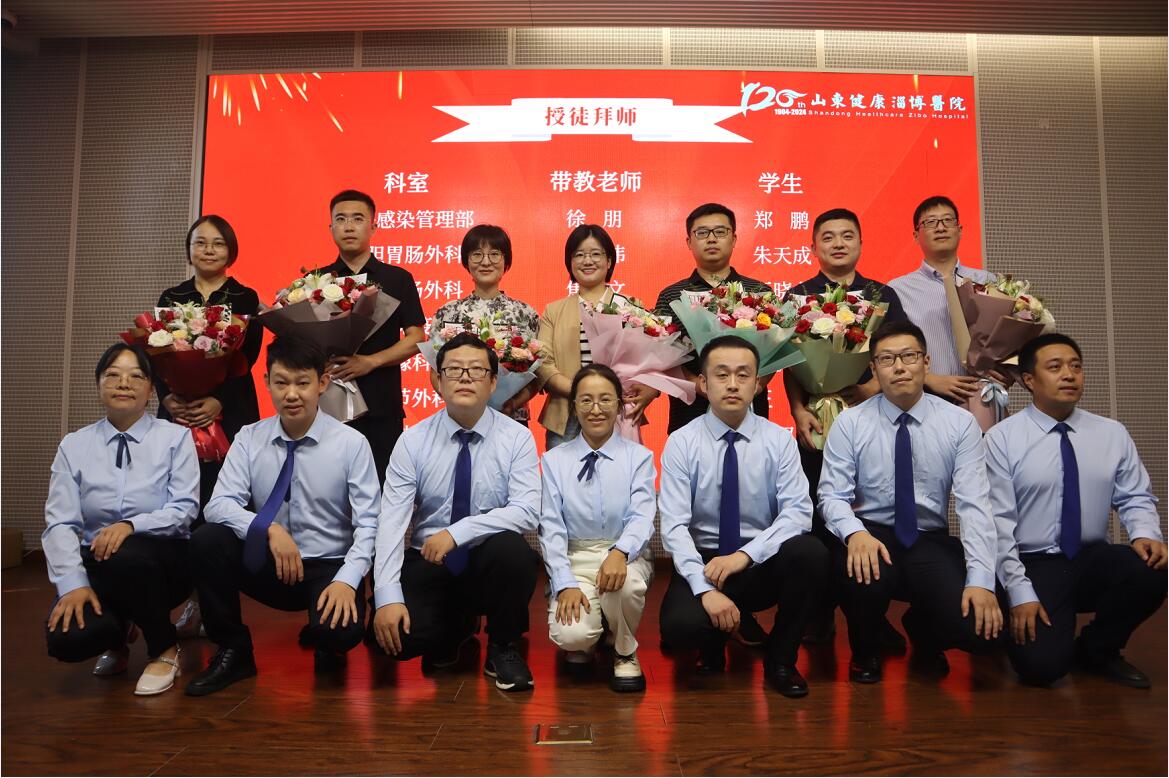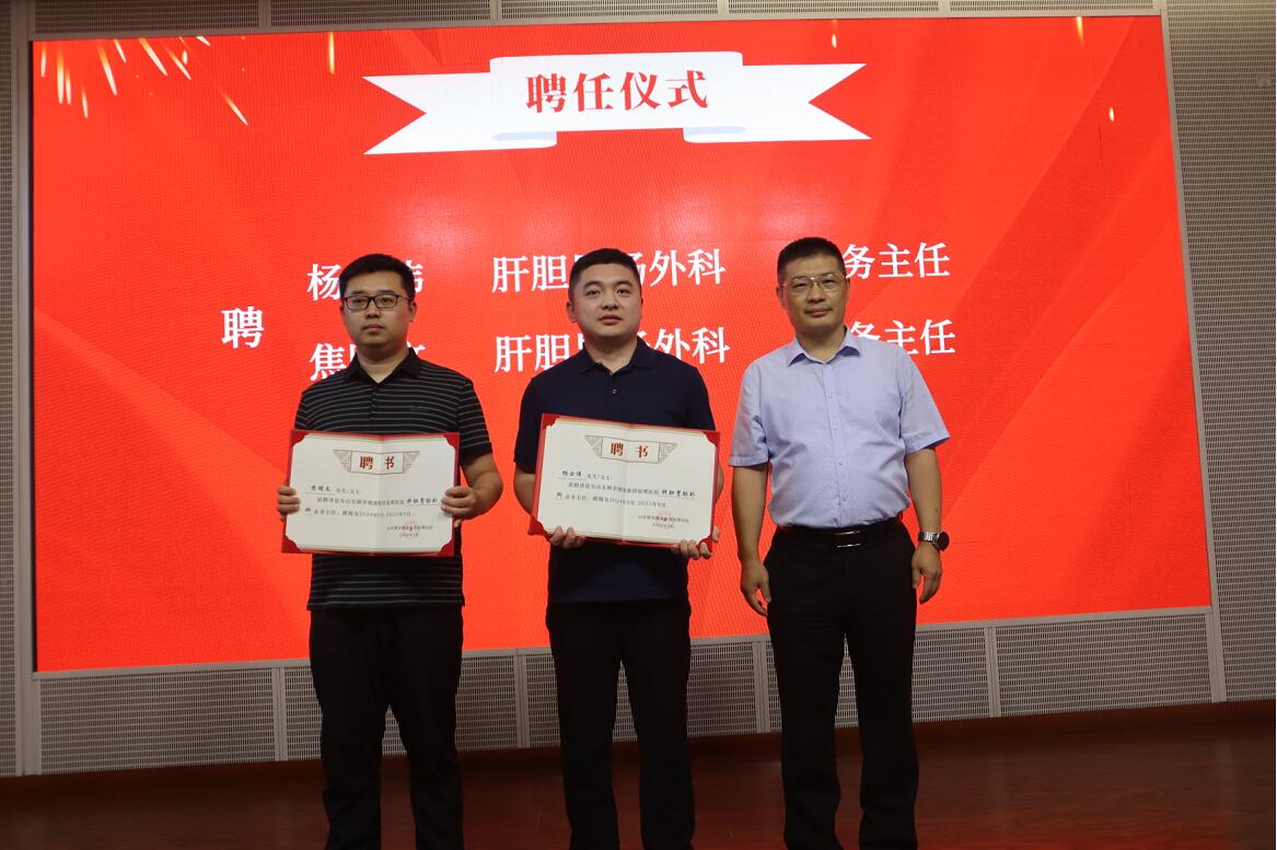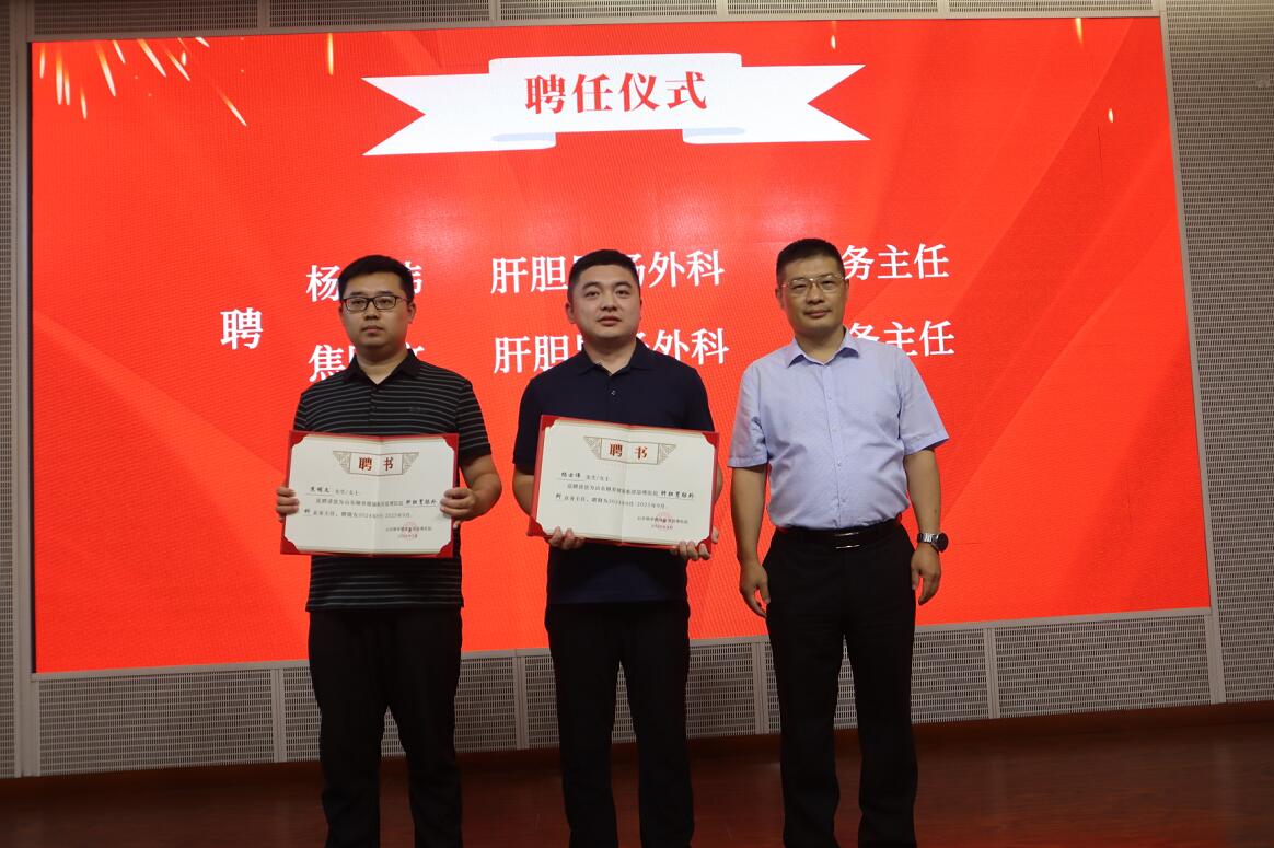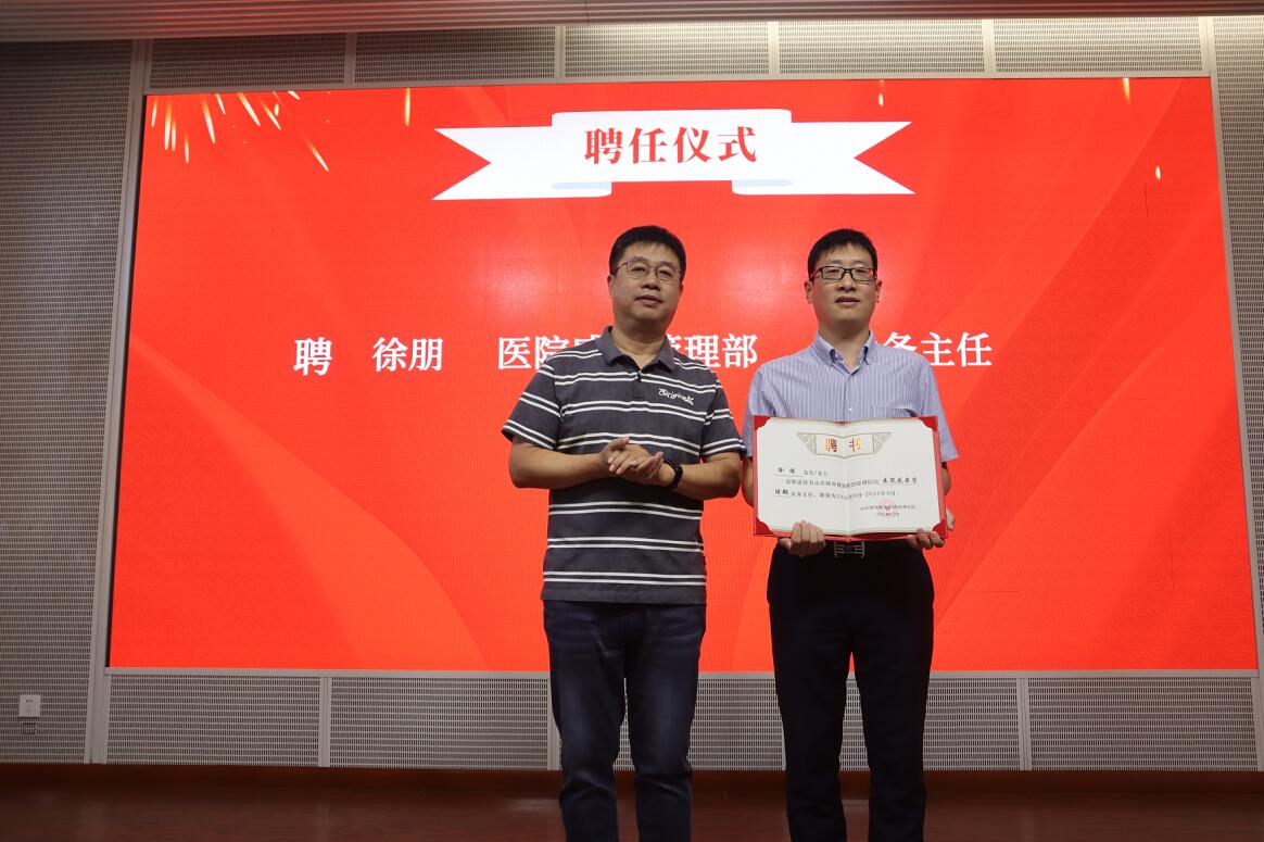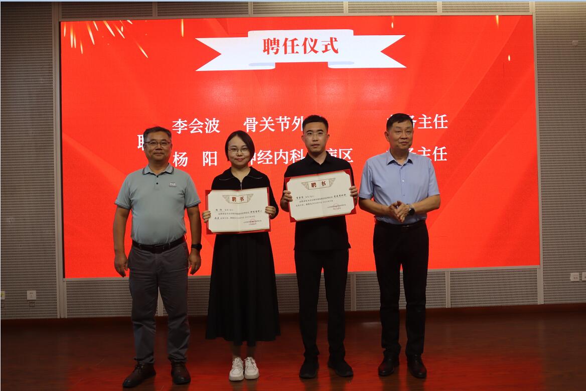 会议现场宣读聘任文件及颁发聘书,聘任徐朋博士后为医院感染管理科业务主任,焦明文博士、杨士伟博士为肝胆胃肠外科业务主任,孙聪聪博士为血液免疫科业务主任,姜舒博士为影像科业务主任,李会波博士为骨关节外科业务主任,杨阳博士为神经内科一病区业务主任。仪式现场进行了授徒拜师仪式。