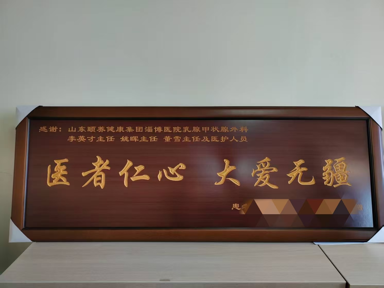 3月12日,我院乳腺与甲状腺外科医护团队收到了一份特殊的礼物——一位患者送来的牌匾,上面写着“医者仁心,大爱无疆”八个大字,以此表达对乳腺与甲状腺外科全体医护人员的感激之情。