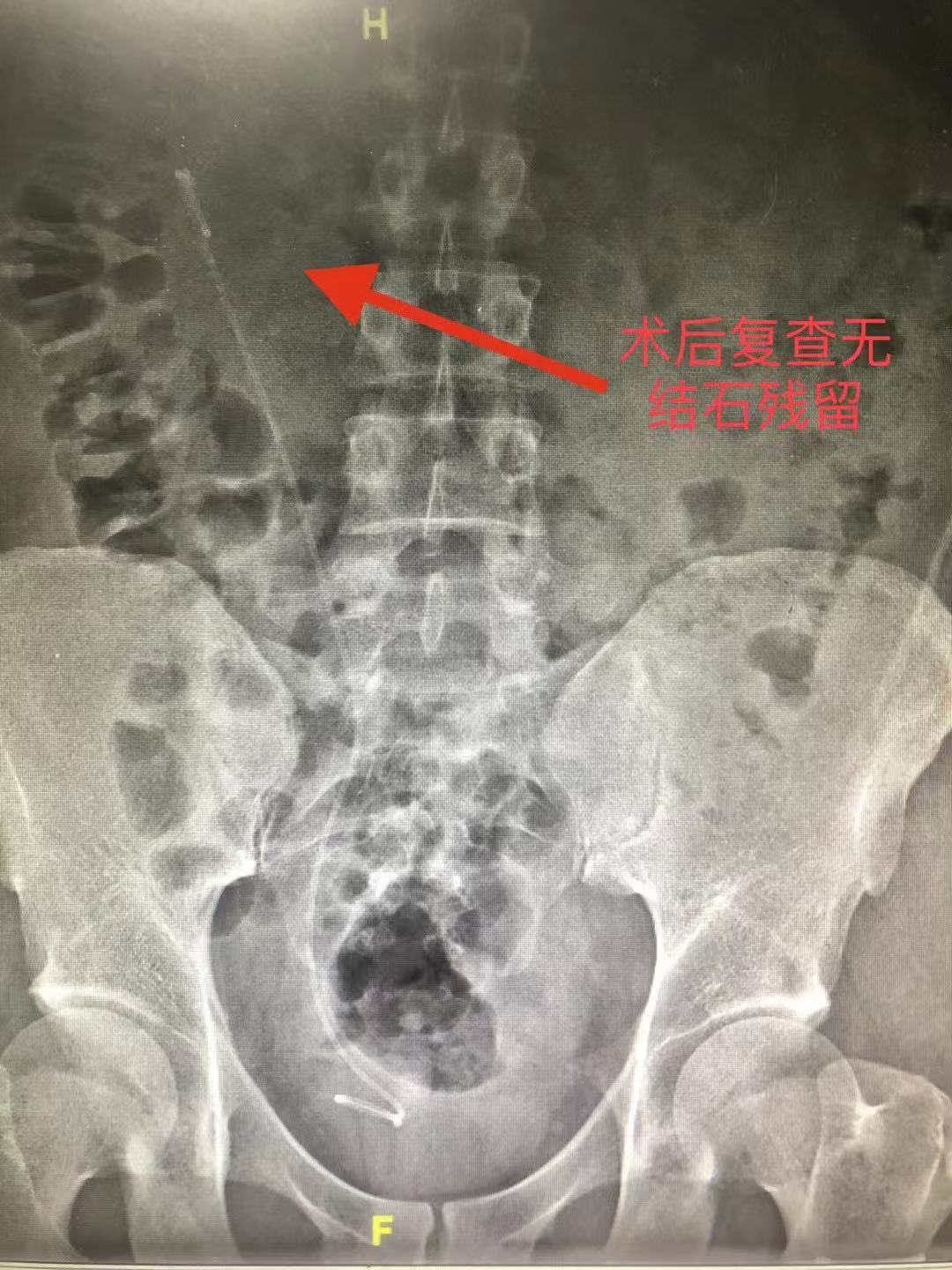 术后患者未出现发热、出血等并发症,术后第一天拔除导尿管并恢复自主排尿,复查腹部平片未见明显结石残留。术后第三天患者步行出院,出院时血肌酐值稳定,腰痛症状完全缓解。相较于传统开放手术或经皮肾镜手术,该术式显著缩短住院时间,减轻术后疼痛,实现“无创口、快恢复”的治疗目标。