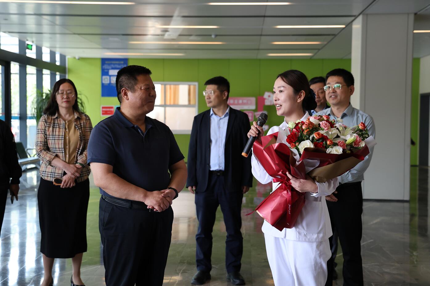 5 月 12 日国际护士节上午,淄川区卫健局党组书记、局长翟配海率队一行 4 人,走进我院,为坚守岗位的白衣天使们送上鲜花与诚挚祝福。医院领导班子成员及 30 余名护士代表齐聚一堂,共同感受这份温暖与敬意。