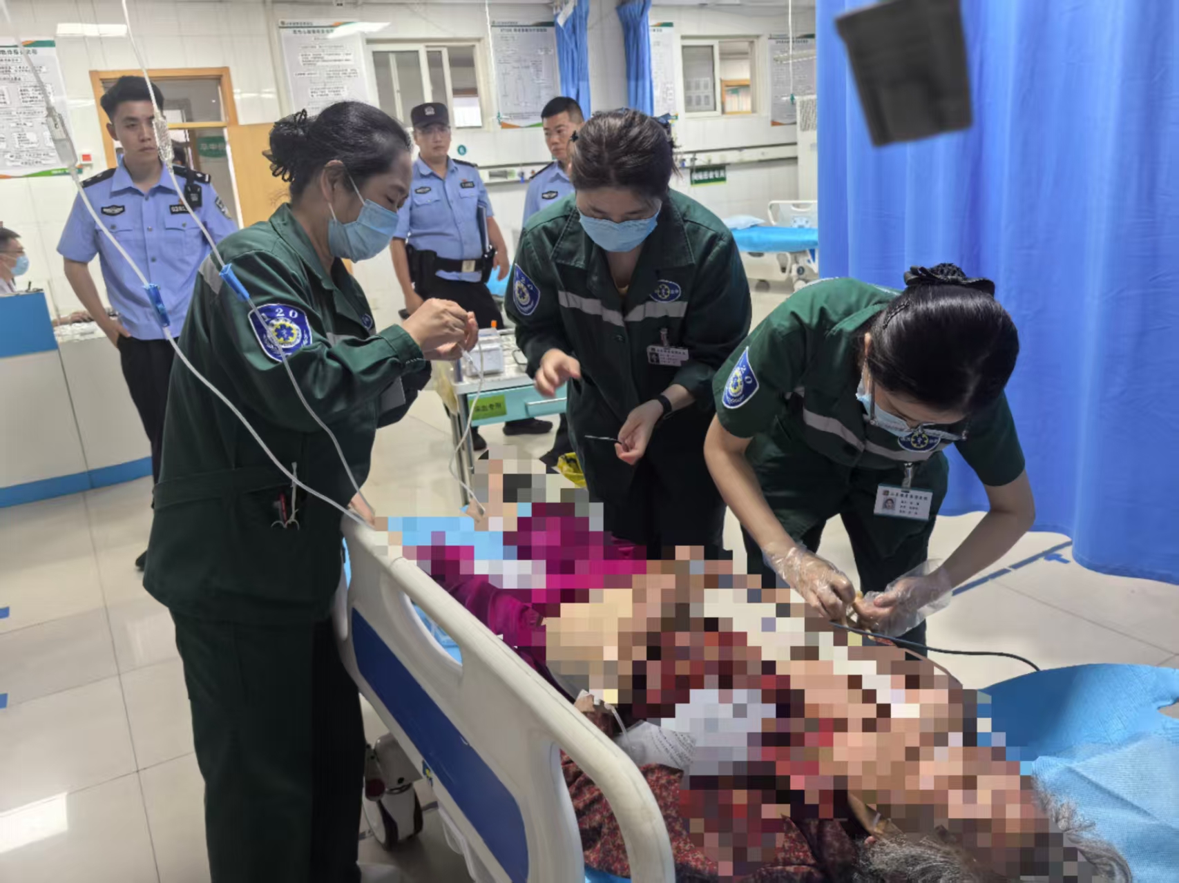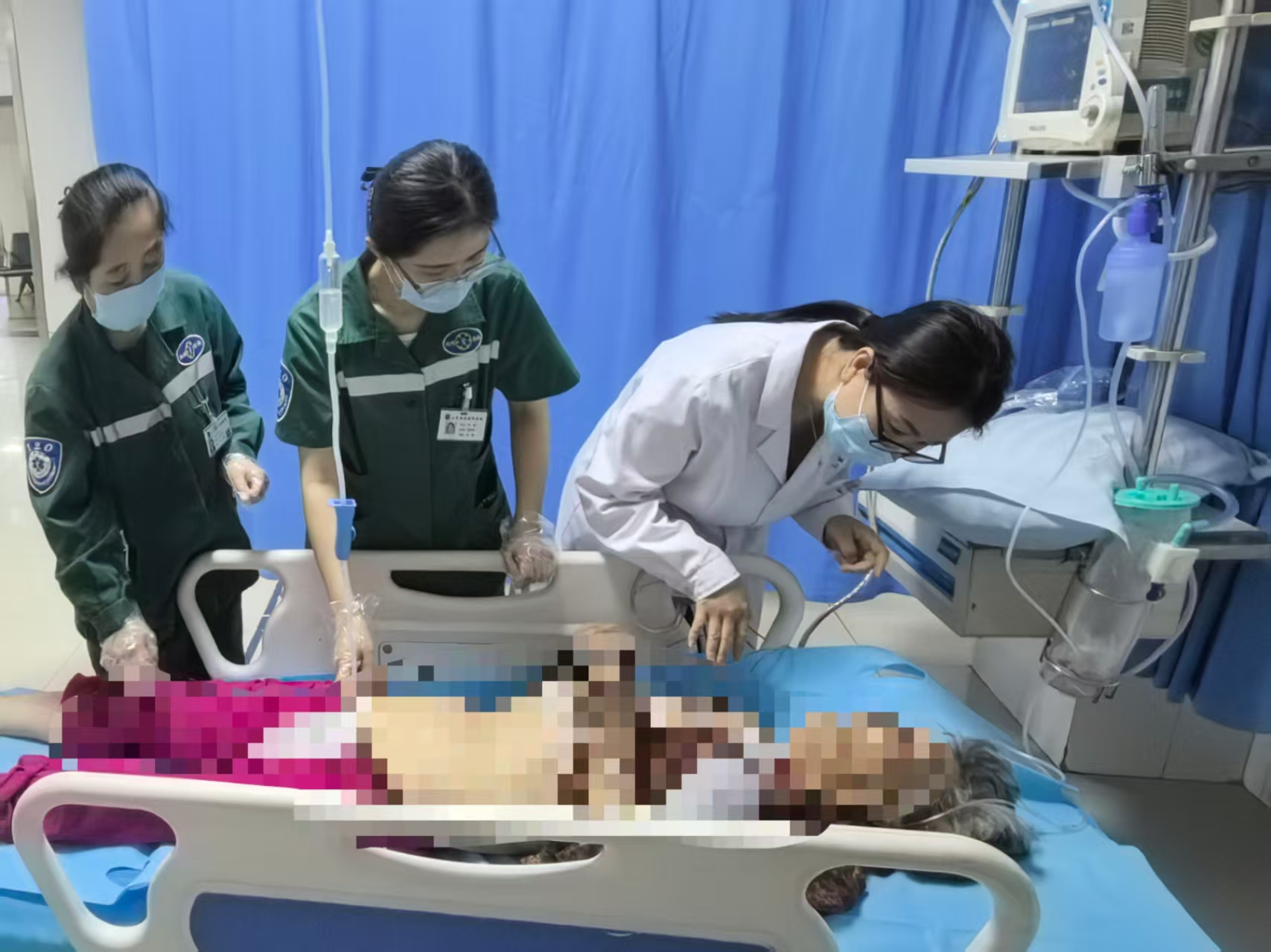 医护人员立即启动绿色通道,在转运途中密切监测患者生命体征,给予现场降温措施,包括建立冰盐水静脉通路、凉毛巾覆盖四肢、冰袋冷敷颈部及大血管处等物理降温手段,以争取抢救时间。12分钟后,患者被送至医院急诊科,抢救团队迅速展开全面救治,包括脱去衣物散热、冰袋冷敷、持续冰盐水静脉输注、心电监护、吸氧及导尿等措施,并全程护送完成紧急检查。