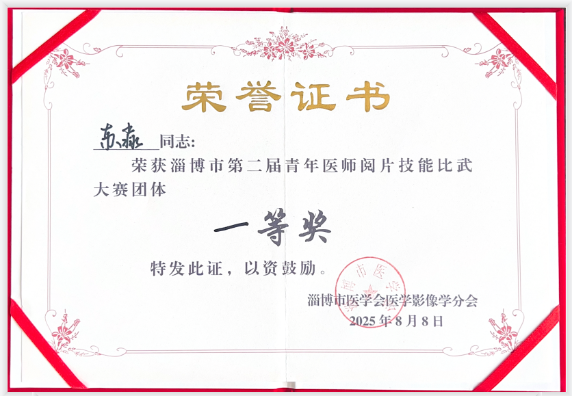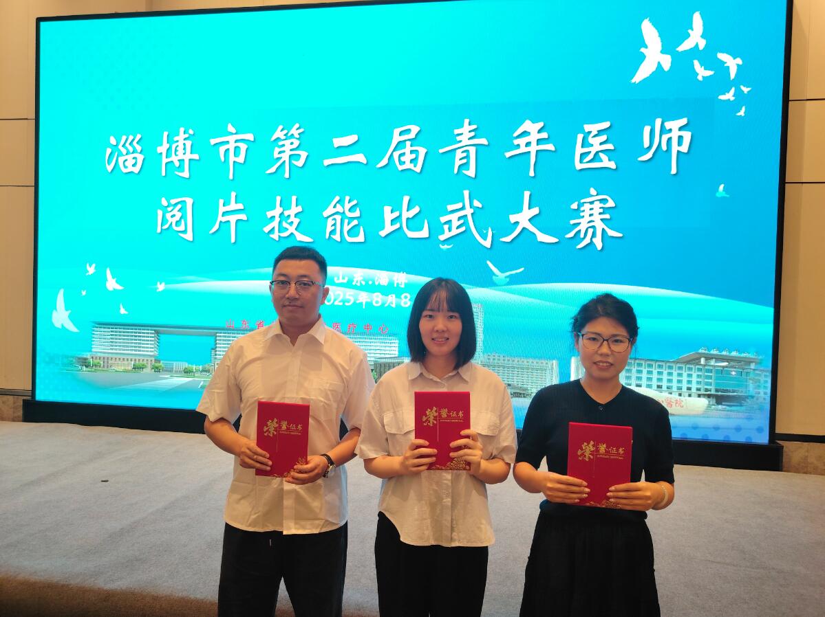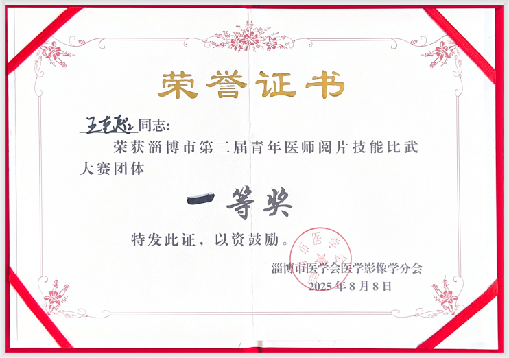 8 月 8 日,淄博市医学会医学影像学委员会主办的 “淄博市第二届青年医师阅片技能比武大赛”如期举行,共有来自全市 11 支医疗机构代表队的 33 名青年医师参赛。我院影像科的王艺超、苏淼两名青年医师最终取得团体一等奖的优异成绩。